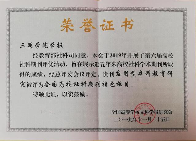 近日,全国高校文科学报研究会第六届全国高校社科期刊评优活动获奖名单揭晓。《三明学院学报》荣获“全国高校社科优秀期刊”称号,《三明学院学报》已连续三届获此殊荣;栏目“应用型本科教育研究”被评为“全国高校社科期刊特色栏目”,编辑刘建朝获评“全国高校社科期刊优秀编辑”。