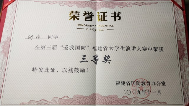 近日,第三届“爱我国防”福建省大学生主题演讲大赛决赛暨全国大赛福建选拔赛在泉州师范学院特教大楼1号学术厅举行。经过激烈角逐,文化传播学院苏栎荧、刘琦两位同学代表三明市国防教育办公室参赛荣获三等奖,三明学院获优秀组织奖。
