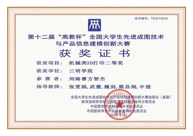 近日,由教育部高等学校工程图学课程教学指导委员会、中国图学学会制图技术专业委员会和中国图学学会产品信息建模专业委员会主办,浙江大学宁波理工学院承办的第十二届全国大学生先进成图技术与产品信息建模创新大赛顺利落下帷幕,我校机电工程学院代表队获得机械类3d打印单项二等奖。
