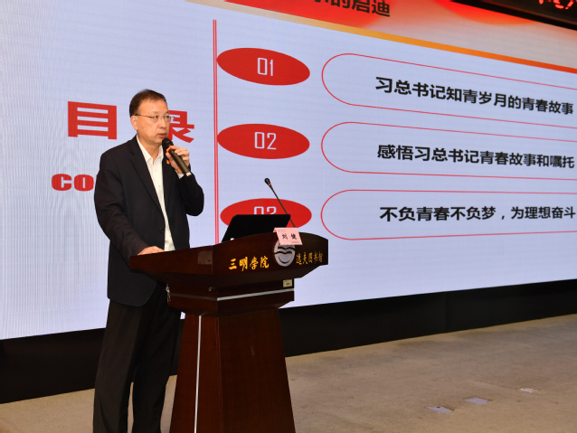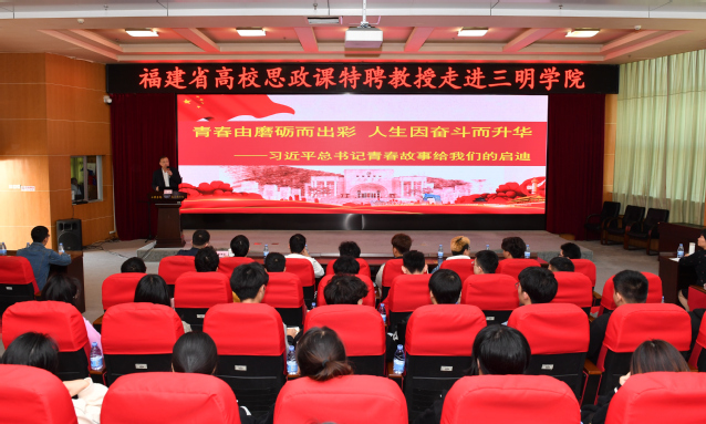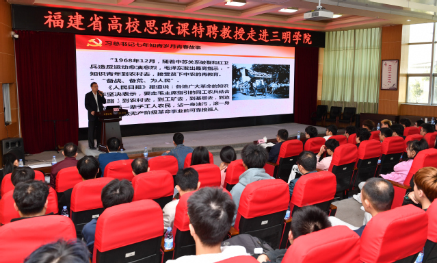 11月11日,福建省教学名师、高校思想政治理论课特聘教授,福建省委教育工委委员、教育厅正厅长级副厅长、博士生导师刘健教授应邀走进三明学院,以《青春由磨砺而出彩,人生因奋斗而升华——习近平总书记青春故事给我们的启迪》为题,为我校2019级产品设计、视觉传达设计、动画等专业的同学们带来了一堂有情感、有温度、有高度、接地气的思想政治理论课。