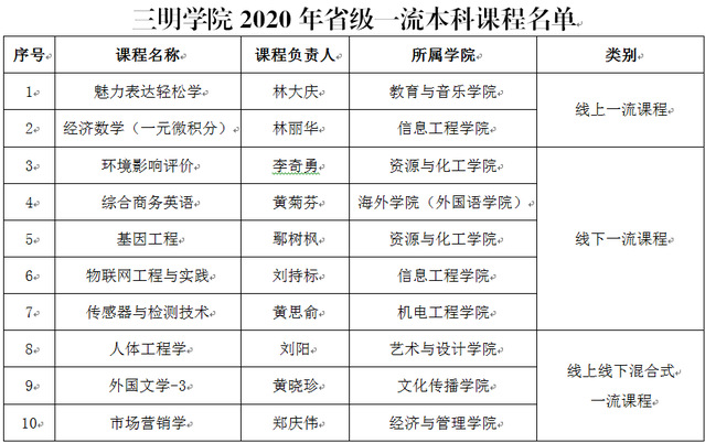 近日,省教育厅公布了2020年省级一流本科课程名单,我校共有24门课程被认定为省级一流本科课程,其中线上一流课程2门、线下一流课程5门、线上线下混合式一流课程12门,虚拟仿真实验教学一流课程2门、社会实践一流课程3门。