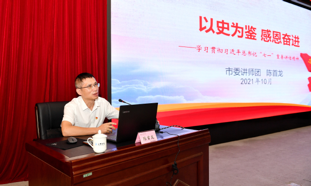 10月15日上午,我校机关党委在图书馆报告厅召开学习习近平总书记“七一”重要讲话宣讲会,邀请市委宣传部部务会成员、讲师团团长陈首龙同志来校作题为“以史为鉴 感恩奋进”专题报告,机关教辅部门全体成员参加学习会。