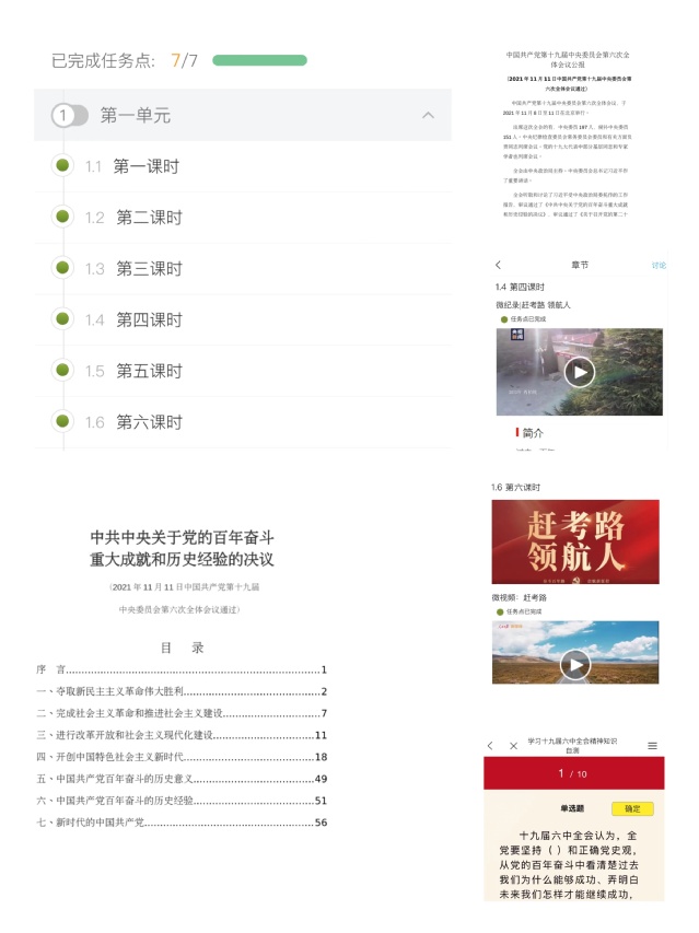 线上,3个主要文件、4个专题视频、1个主题讨论、N场知识测试......学习通平台上精心设计的八个课时“学习套餐”,将学习拓展到“八小时”之外的“指尖课堂”。线下,二级中心组读书班、党员大会、主题党日、预备党员培训班专题辅导......全院上下坚持“第一议题”学习机制,全覆盖开展学习讨论活动。师生们对党的十九届六中全会精神从初步了解到有了深刻的认识。