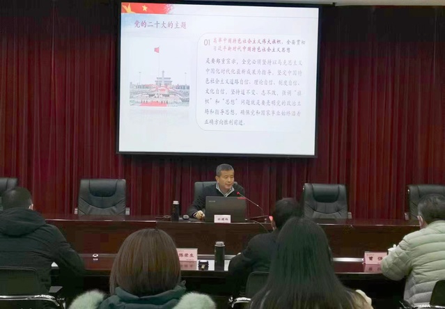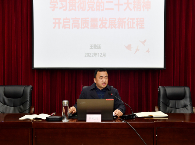 12月14日下午,校党委副书记、校长王乾廷在行政楼八楼会议室作党的二十大精神宣讲报告,学校各二级学院处、科级干部近百人到场聆听。