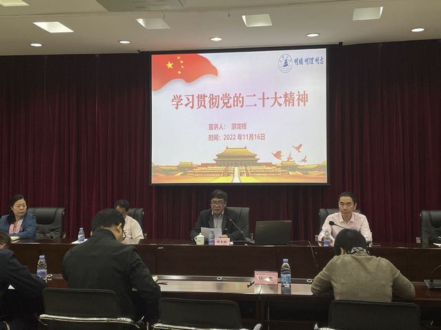 11月29日下午,校党委委员、副校长吴龙在行政楼五楼会议室宣讲党的二十大精神。人事处、校工会全体教职员工参加了报告会。