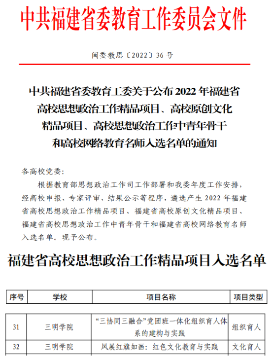 日前,中共福建省委教育工委公布2022年福建省高校思想政治工作精品项目、高校原创文化精品项目、高校思想政治工作中青年骨干和高校网络教育名师入选名单,学校组织育人项目《“三协同三融合”党团班一体化组织育人体系的建构与实践》、文化育人项目《风展红旗如画:红色文化教育与实践》成功入选省高校思想政治工作精品项目。