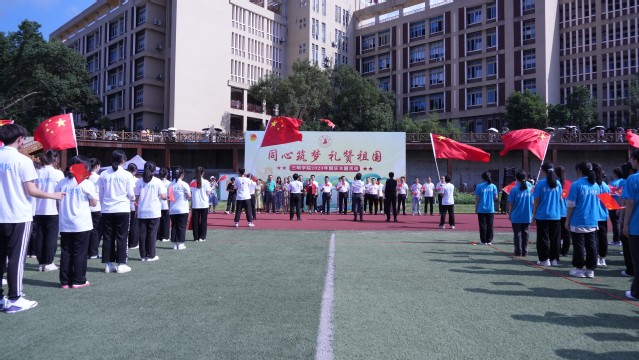笑脸灿灿,红旗飘飘,校园到处洋溢着节日的喜庆。1200余名学生齐聚北区田径场,用舞蹈、齐诵、歌声和快闪,表达对祖国的深深祝福。
