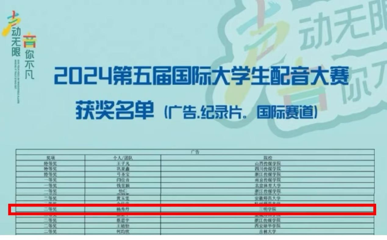 本次大赛共吸引了来自北京大学、浙江大学、中国传媒大学、浙江传媒学院、阿姆斯特丹大学、英国威斯敏斯特大学等全球412所高校大学生踊跃参与,参赛作品13760件,近700支队伍进入线下复赛。在个人赛事中,由文化传播学院教师王劭政指导、2024级播音与主持艺术专业学生杨秀丹荣获广告组二等奖;在团队赛事中,由王劭政老师指导、2023级播音与主持艺术专业学生李昊然、张晓焮组成的“让子弹一直飞”队荣获影视组三等奖;王劭政老师获得优秀指导教师奖,三明学院获得最佳组织奖。这也是我校首次参加该比赛并获得佳奖。