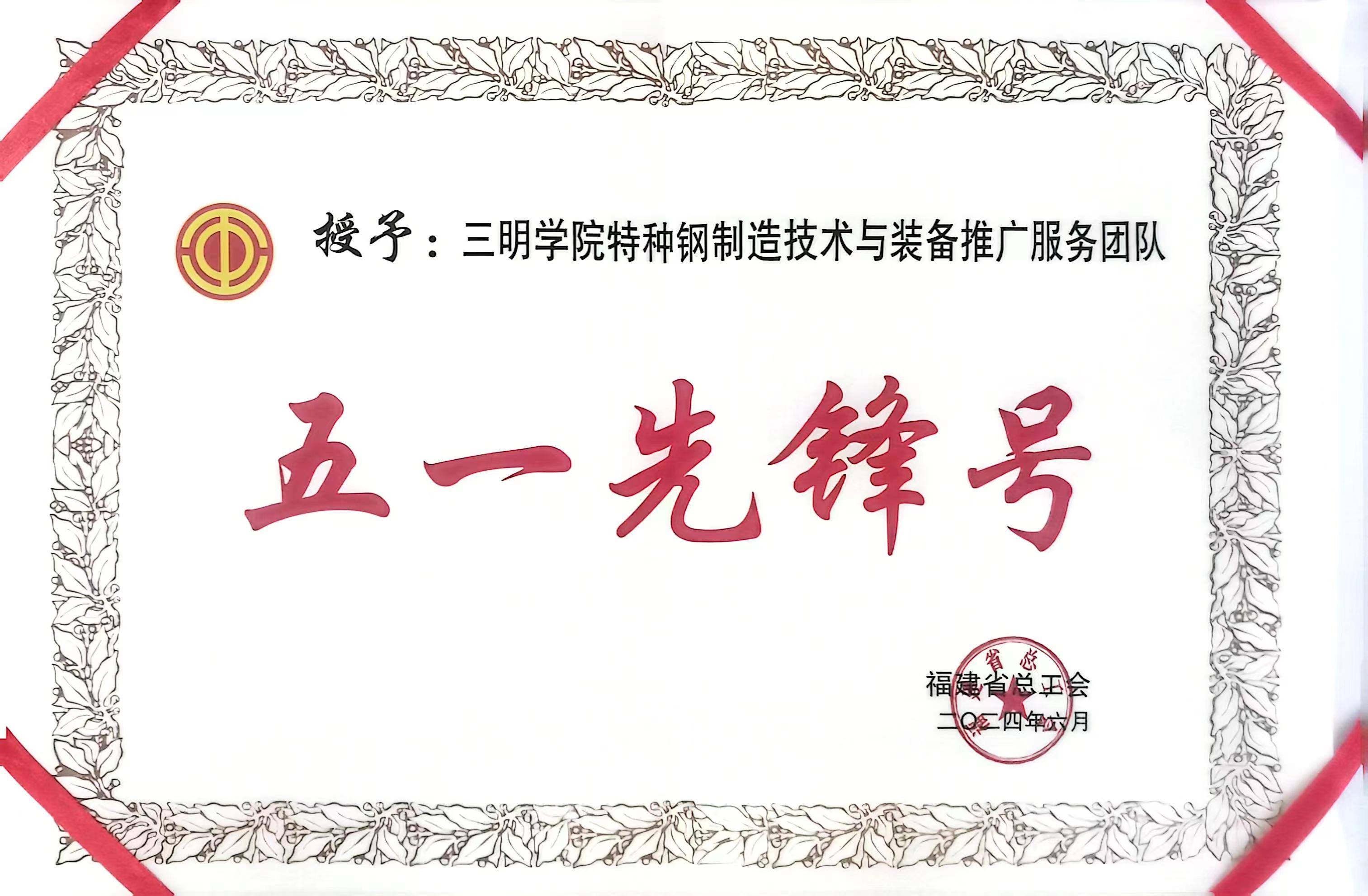 近日,福建省总工会公布了2024年福建省五一先锋号获奖名单,我校三明学院特种钢制造技术与装备推广服务团队荣获福建省五一先锋号。
