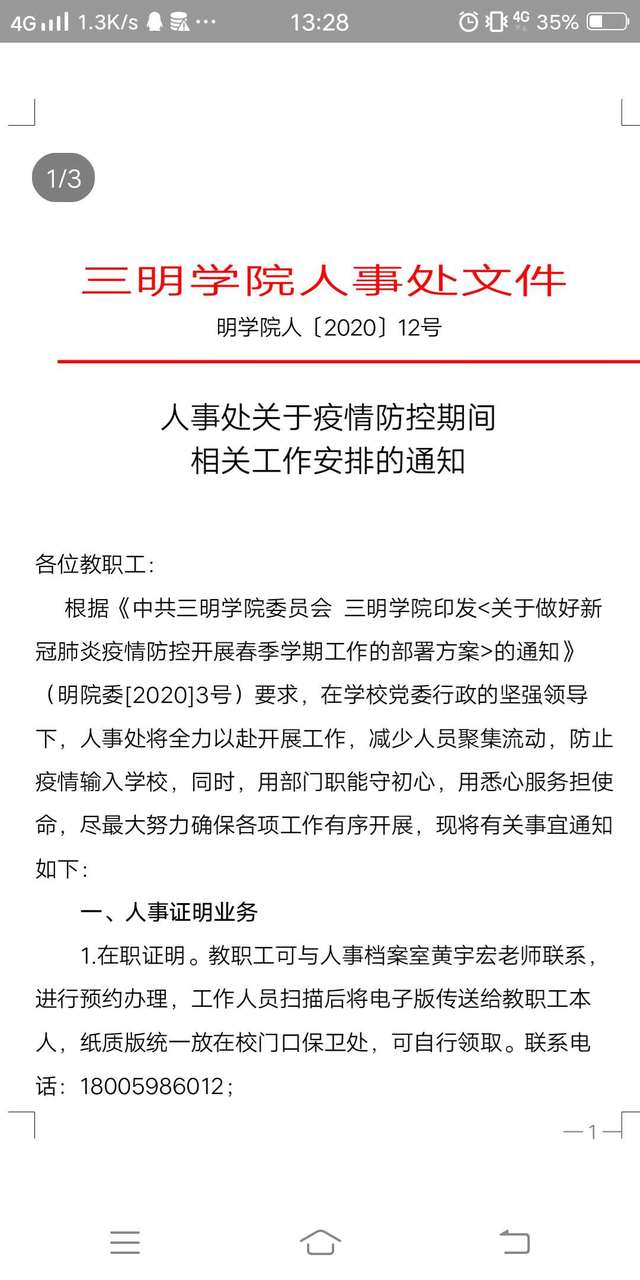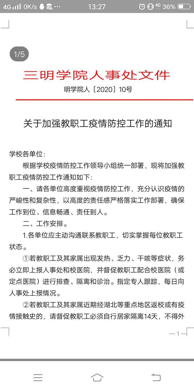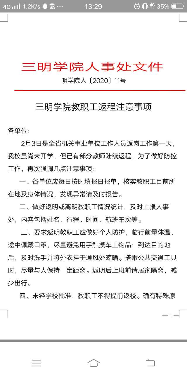 认真落实学校疫情防控工作安排,切实担负起疫情防控相关责任。根据学校《新型冠状病毒感染的肺炎疫情防控工作应急预案》文件精神,按照学校疫情防控工作分工,先后制定了《人事处防疫工作预案》《关于加强教职工疫情防控工作的通知》《三明学院教职工返程注意事项》,发布《三明学院教职工假期返程情况调查问卷》,对全校1049名教职工假期出行、身体健康等情况进行了摸底统计和重点关注。