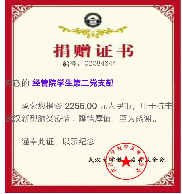 线上筹集善款,同舟共济。支部党员在疫情防控战“疫”中献爱心,担作为,主动向武汉大学教育发展基金会捐款2千余元用于抗击武汉武汉新冠肺炎疫情。在支部的带领号召下,又有其他班级捐款4千余元,为抗击战疫情凝聚爱心。