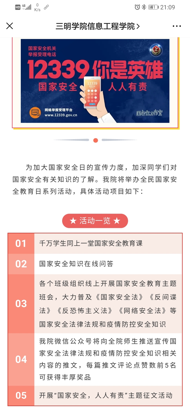 此次安全教育日系列活动,进一步提高信息工程学院全体师生的国家安全防范意识和能力,牢固树立起“国家安全无小事”观念,营造“国家安全 人人有责”的浓厚社会氛围,不断筑牢广大师生安全意识防线,不断坚定师生保卫中华、战“疫”必胜的决心和勇气。