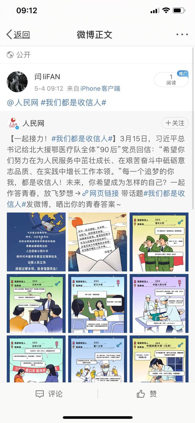 在五四青年节到来之际,海外学院(外国语学院)全体师生积极响应教育部思政司“我们都是收信人”的号召,第一时间引领全院师生积极开展学习,通过关注人民网微信公众号、微博助力主题活动等形式参与回信互动,掀起了学习重要回信精神的热潮。