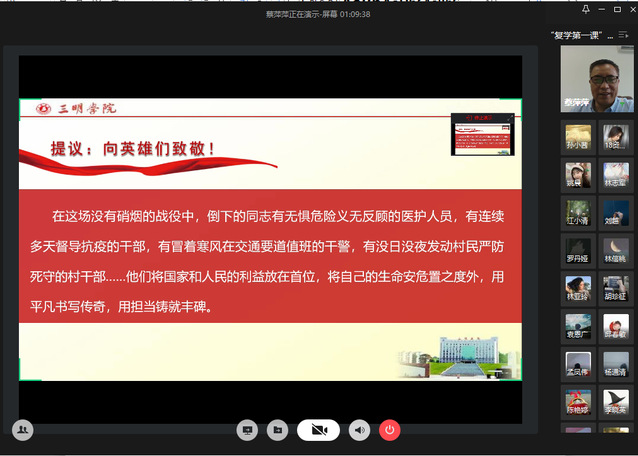6月4日下午,为落实校领导班子成员为大学生上讲授思政课的工作要求,结合当前疫情防控实际,三明学院副校长张君诚线上为资源与化工学院学生开讲复学思政第一课。教务处、资源与化工学院生物专业学生及部分辅导员线上观看聆听。