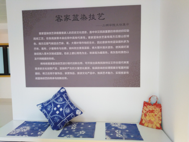 艺术与设计学院教工第二党支部于2020年5月与三明市非物质文化遗产中心合作,积极投入到三明市客家服饰非物质文化遗产展示工作中,并在三明市非物质文化遗产展示馆里设立了客家蓝染技艺——三明学院文创展示区。此次三明市非物质文化遗产展示由三明市文化和旅游局主办,为长期性展览,旨在传承和发扬我市珍贵的、濒危的并具有历史、文化和科学价值的非物质文化遗产。