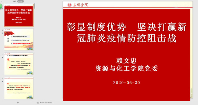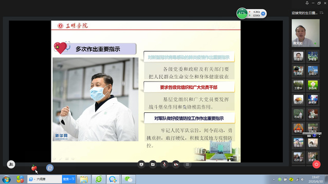 在喜迎中国共产党成立99周年之际,为贯彻落实省教育工委关于开展高校基层党组织常态化疫情防控“四个一”行动的工作部署和校党委组织部关于开展“庆祝建党99周年 喜迎第三届党代会”系列活动方案的总体安排,资源与化工学院教工第一、第二党支部利用企业微信视频会议系统联合召开主题党日活动暨专题组织生活会。
