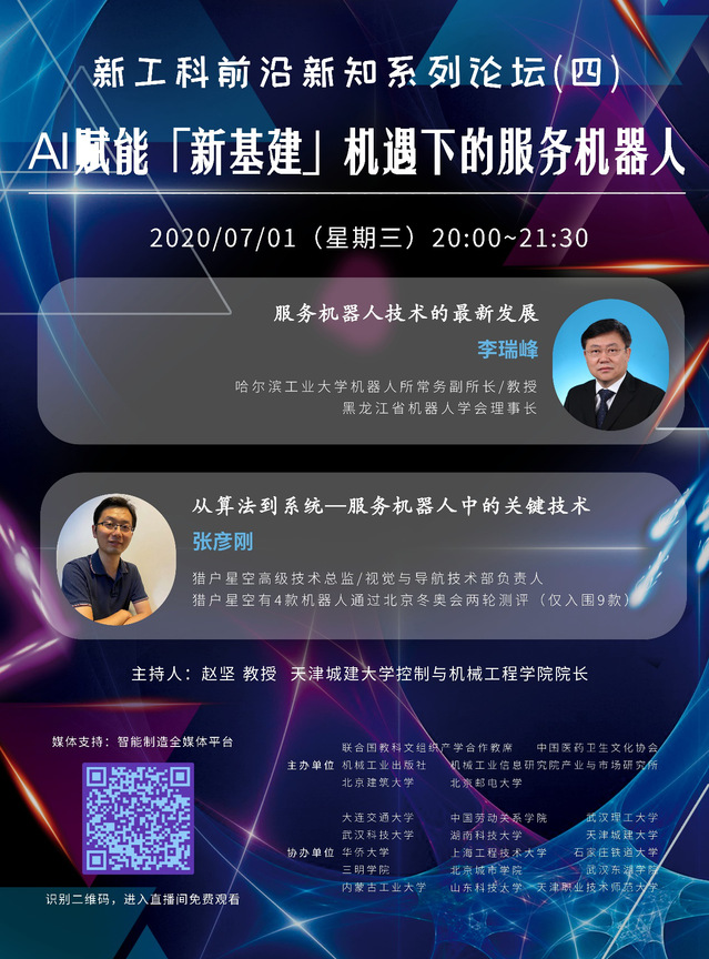 2020年7月1日由联合国教科文组织产学研合作教席、北京建筑大学承办、三明学院等12所高校协办的新工科前沿新知系列论坛- AI赋能“新基建”机遇下的服务机器人,在机械工业出版社的九州云播进行网络直播,13所高校7000余名学子参加论坛直播,三明学院机电工程学院车辆工程系、机械系、电子系老师及17车辆、18车辆、18车辆高职、17机械等多个班级参加此次论坛。