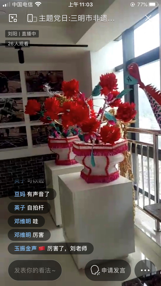 “大家现在看到的是我们民间习俗展区,展区里面展的主要是以实物和图片为主的民间习俗,比如说这个是大田的板凳龙的龙舞……”在直播中,刘阳老师对三明市永安大腔戏、泰宁梅林戏、竹纸制作技艺、客家服饰等非遗项目,特别是对自己支部的客家蓝染技艺文创作品展进行了重点讲解。“我们的客家蓝染技艺文创作品体现了传统客家服饰文化与现代创新应用的完美融合!”支部党员余水妹感慨道。