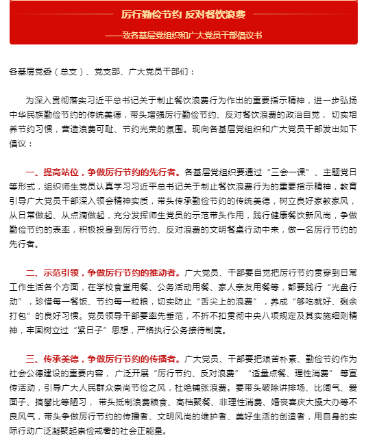 各支部书记领学习近平总书记关于制止餐饮浪费行为作出的重要指示精神、《厉行勤俭节约反对餐饮浪费——致各基层党组织和广大党员同志倡议书》,教育引导师生党员以身作则,在工作生活中厉行勤俭节约,保持艰苦朴素优良传统。