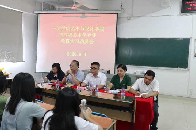 为深入贯彻落实学校、师范学部对师范专业教育实习工作的安排部署,扎实推进我院2017级美术学专业教育实习工作,艺术与设计学院于2020年9月4号上午在博学楼315教室专题召开2017级美术学专业教育实习动员会。三明学院副校长、师范学部主任张君诚教授、师范学部陈秀琼副主任、艺术与设计学院邱国鹏院长、院党委罗奋涛书记、官丽雅副书记、实习带队教师以及2017级美术学专业全体实习生参加会议,会议由艺术与设计学院党委书记罗奋涛教授主持。