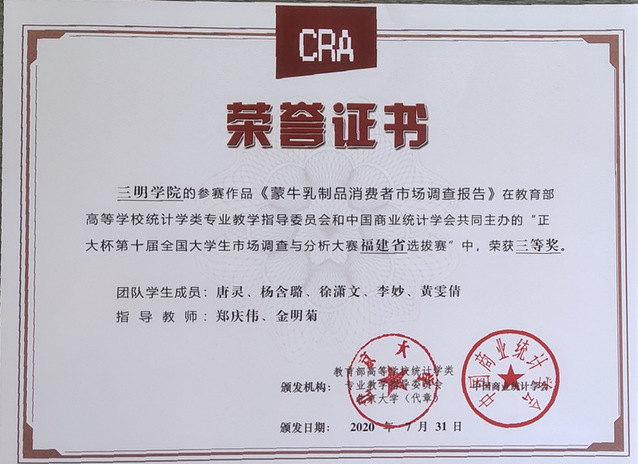 2020年7月,“正大杯”第十届全国大学生市场调查与分析大赛福建赛区选拔赛结果揭晓,经济与管理学院2017级电子商务专业学生组成“跳槽营销的码农”队,其作品《蒙牛乳制品消费者市场调查报告》获得三等奖。