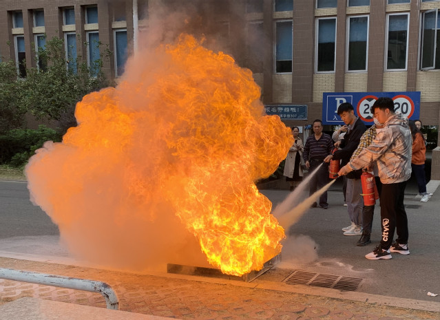 防灾避险,示范先行,在演练现场,熊熊烈焰燃起,一名手持灭火器的“消防员”向大家详细介绍了灭火器的构造,并现场示范使用方法。详尽的讲解让同学们获益匪浅,几位大胆的同学还主动上前尝试使用灭火器灭火。