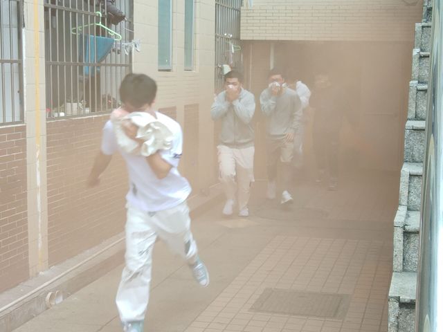 一切准备就绪,随着现场一阵气味强烈的烟雾弥漫开来,并迅速淹没了整个楼道,随即警示哨声响器起,同学们弯腰低头,用毛巾或者衣物捂住口鼻,迅速、有序地从厚德楼、紫荆园7号宿舍楼撤离至篮球场列队集合。