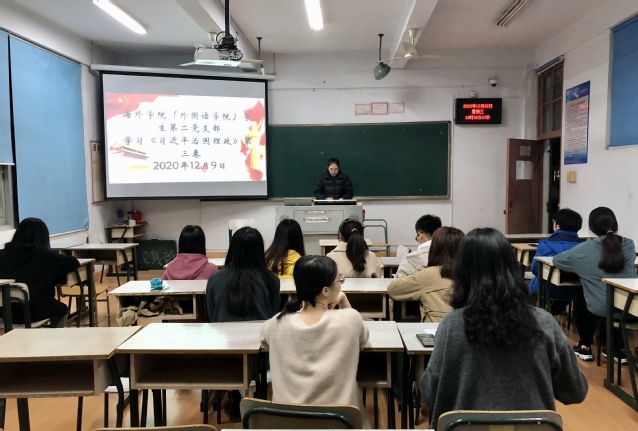 12月9日晚在外语楼405,海外学院(外国语学院)学生第二党支部开展学习《习近平谈治国理政》第三卷《决胜全面建成小康社会,夺取新时代中国特色社会主义伟大胜利》,由支部书记陈旭老师领学。支部党员以线上线下相结合的方式参加。