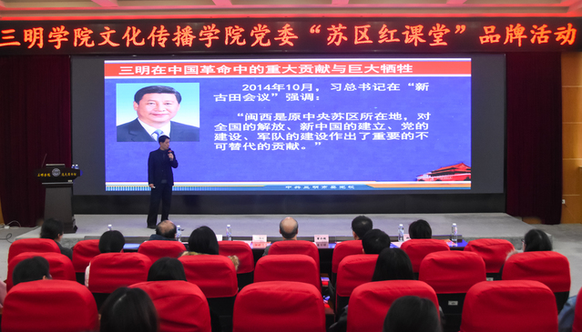 2020年12月18日下午,由文化传播学院党委举办的“苏区红课堂”品牌活动在三明学院图书馆学术报告厅举行。活动邀请了三明市委党校陈锦琪副教授、清流县博物馆干部曾丽红、三明市公安局干部梁泰明、商务局干部卢凌云、体育局干部汪洋等宣传团成员莅临现场宣讲。文化传播学院院书记、副书记、副院长等院领导出席活动。文化传播学院师生党员和积极分子到场参加活动。