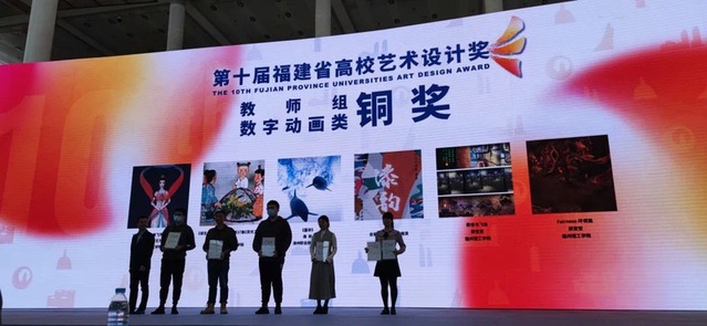 我校艺术与设计学院师生5件作品获得高校设计奖,其中吴晓华老师指导的作品《惠安女人》获学生组数字动画类金奖,《比美》获学生组数字动画类铜奖,张俊杰、张俊雄老师的作品《郑成功之收复台湾》获教师组数字动画类银奖,念家雯老师的作品《漆韵》获教师组数字动画类铜奖,张苑老师指导的作品《三碗不回家》获学生组数字动画类铜奖。学院的参赛作品得到了大赛组委会及评委们的高度评价。