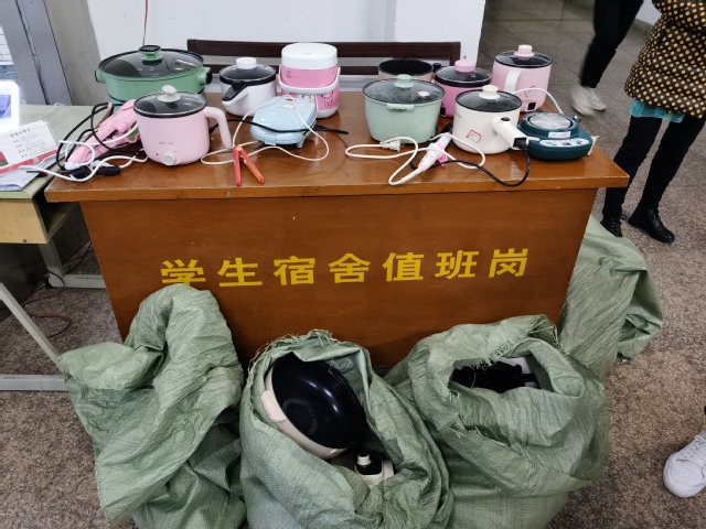 本次检查主要针对宿舍是否有乱拉电线、不注意宿舍卫生以及违规使用大功率电器等违规现象进行专项检查,目的是让同学们做到离开宿舍后要关闭各类电器的开关,做到安全用电。排查过程中,逐一进行了具体指导并提出解决措施,指出宿舍长要各其负责,层层落实。且要求每一位学生要自觉保持室内干净,共同维护安全舒适的居住环境。排查结束后,发现宿舍整体情况较好,但有个别宿舍存在一定的问题,被检查出的电饭锅、热水壶、热得快、卷发棒等违章电器一律予以没收,并且对相关学生进行深刻的批评教育,教育学生远离违规电器,规范日常行为,增强安全意识。