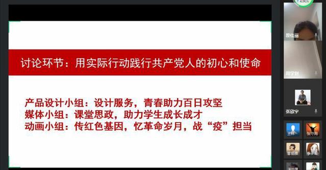 习近平同志在宁德任职期间的理念和实践:亲民为民,责任担当,反腐正风,创新发展。身为党员教师,力所能及地以职业道德、以专业素养带领学生以文化创新创意为社会贡献力量。在议一议环节中,支部以党小组为单位,分别开展了三个议题的探讨:产品设计党小组的“设计服务,青春助力百日攻坚”;数字媒体党小组的“课堂思政,助力学生成长成才”;动画党小组的“传红色基因,忆革命岁月,战‘疫’担当”。三个党小组分别从专业实际、教学实际出发,一方面守好教师的抗“疫”主阵地,另一方面引领学生正确认知世界,勇于担当。