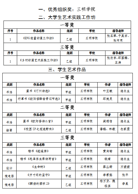 近日,由省教育厅主办的福建省第六届大学生艺术福州落下帷幕。我校在此次大学生艺术节中取得优异成绩,共斩获一等奖4项,二等奖7项、三等奖9项,并荣获“优秀组织奖”。其中《ENG能力动漫工作坊》、篆书《汀州诗选》两个作品以优异的成绩选送全国大学生艺术节。