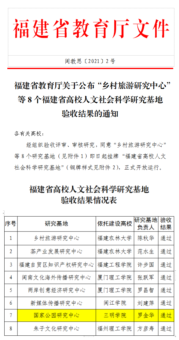近日,福建省教育厅下发了《福建省教育厅关于公布“乡村旅游研究中心”等8个福建省高校人文社会科学研究基地验收结果的通知》(闽教思〔2021〕2号),三明学院人文社会科学研究基地“国家公园研究中心”位列其中,并获批挂铜牌“福建省高校人文社会科学研究基地”正式开放运行。