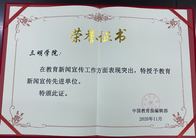 近五年来,获人民日报、光明日报、中国教育报、新华社、人民网、学习强国等国家级媒体报道和省级媒体报道1500余篇,形成以官网、官微为主体,三明学院视频号、三明学院团委为两翼的新媒体工作格局。学校官微拥有近3万粉丝,日前,《中国教育报》编辑部对在教育新闻宣传工作方面表现突出的单位进行了表彰,我校被授予“教育新闻宣传先进单位”荣誉称号。2020年,学校在《中国教育报》《福建日报》等国家级和省市级媒体刊发新闻370余条,尤其,围绕四个创硕点学院,组织策划《中国教育报》《福建日报》《三明日报》《三明新周报》专题宣传,并将11个二级学院的应用型人才培养成效在《三明新周报》上专版宣传,为学校“创应用强校,育致用大才”发展营造了良好的宣传舆论氛围。