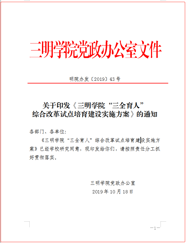 制定出台《三明学院关于深化新时代学校思想政治理论课改革创新的实施意见》《三明学院课程思政建设实施意见》《三明学院“三全育人”综合改革试点培育建设实施方案》等推进铸魂育人。始终高举习近平新时代中国特色社会主义思想伟大旗帜,以全面提高人才培养质量为核心推进育人力建设。实施构建以“三明三康”为主要内容的分层分类一体化引领体系。传承弘扬“苏区精神”“致用基因”“三杆教育”, 持续开展“尊师爱生月”“教学相长月”“科研推进月”“校风提升月”“党建引领月”等五个主题月活动,师生教育精准发力,为打造“三区”高校“三全育人”样板奠定基础,成功入选省高校“三全育人”综合改革试点培育建设单位。