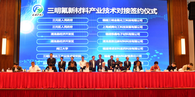 会上还举行了三明氟新材料产业技术对接签约仪式,共有7个项目签约,其中产业项目4个、总投资5.24亿元。包括三元区政府与金氟化工签订《总投资5000万元的氟化碳和全氟聚醚油项目》,与威腾化工签订总投资2.5亿元的年产3000吨含氟表面活性剂项目;清流县经济开发区与雅鑫电子签订《总投资6千万元的半导体酸性线路蚀刻液生产项目》,与致远新材料签订《总投资1.64亿元的六氟锑酸钠二硫化钨生产项目》;闽江学院与博诺安科医药签订《氯吡菌酰胺产业化技术研究项目》;三明氟化工产业技术研究院与福建三农新材料签订《含氟烯烃高值化利用项目》,与三明金氟化工签订《含氟精细化学品的工艺技术开发项目》。签约过后三元区经济开发区围绕相关招商政策对三元氟新材料产业进行重点推介。