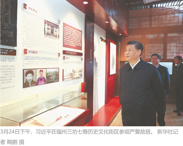 在九曲溪畔的朱熹园,习近平指出,要推动中华优秀传统文化创造性转化、创新性发展,以时代精神激活中华优秀传统文化的生命力。在福州三坊七巷历史文化街区考察时,习近平强调,保护好传统街区,保护好古建筑,保护好文物,就是保存了城市的历史和文脉。对待古建筑、老宅子、老街区要有珍爱之心、尊崇之心。