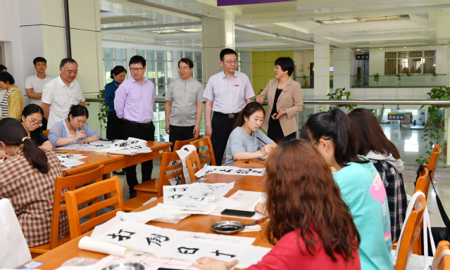 随后,廖景榕、相关部门负责人及师生在图书馆北二阅览区观看校书法协会50余名师生的红色标语书写,在图书馆北一展厅观看“‘奋斗百年路 启航新征程’百年党史图片展”。