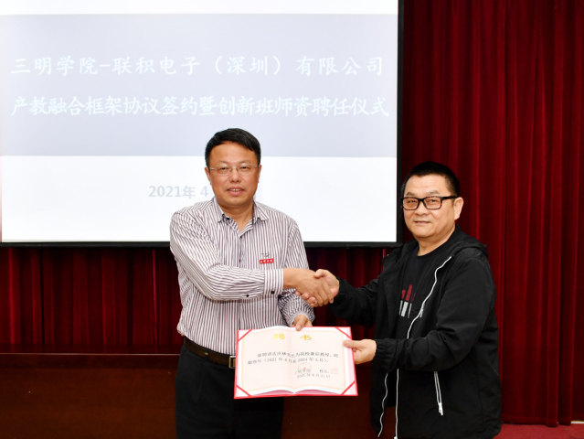 潘玉腾校长与联积电子蔡薇董事长签署了共建“电子纸模组创新应用工场”和“电子纸模组人才培养创新班”的协议,并为联积电子董事长特助孟庆林、厂长吕启宏颁发了三明学院客座教授、副教授的聘书。