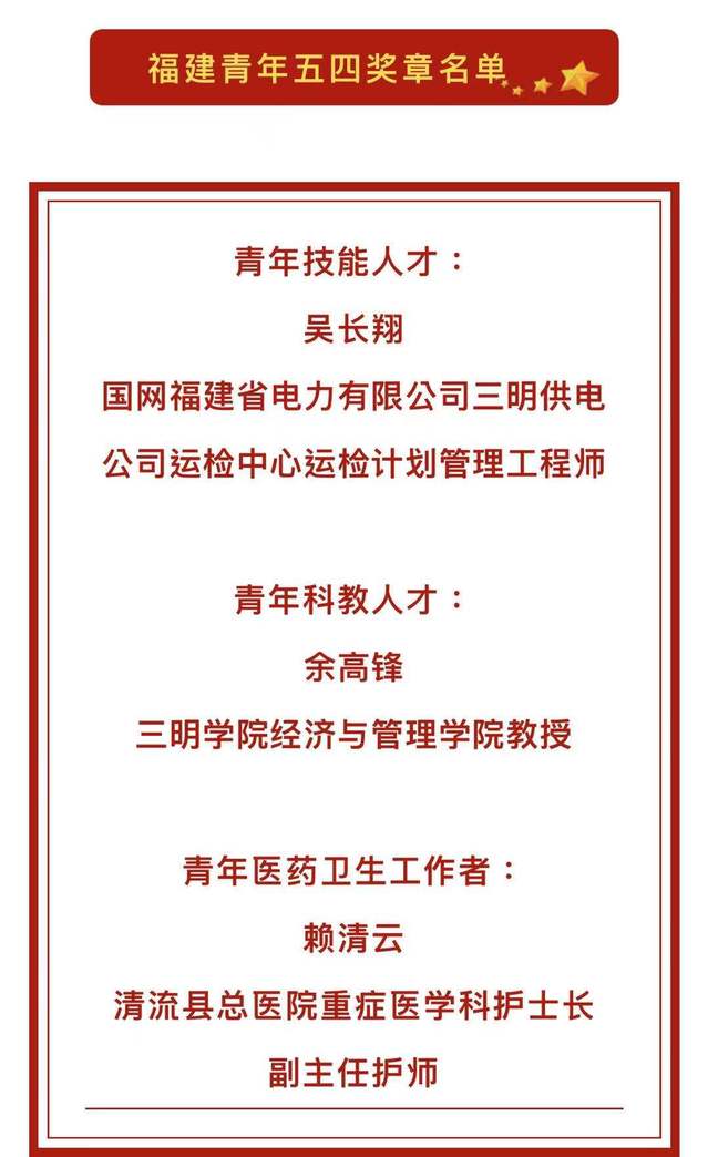 日前,在福建省公布的《共青团福建省委福建省青年联合会关于表彰第十八届“福建青年五四奖章”集体和个人的决定》中,我校经济与管理学院余高锋教授获第十八届“福建青年五四奖章青年科教人才”荣誉称号。