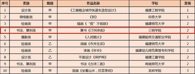 艺术实践工作坊《能量动漫工作坊》以动漫形式宣传科学防疫知识,展现出伟大的战疫精神和新时代青年的责任担当。艺术作品篆书《汀州诗选》在传承传统写法的基础上进行多次创新,呈现出我校学子深厚的书学底蕴和专业自信。高校美育改革创新优秀案例《苏区高校美育在行动——基于“一带一路”应用型音乐人才培养模式创新》有效破解音乐人才培养过程中“学生、教师、课程”等关键要素的协同难题,为同类院校的音乐学专业提供有益借鉴。