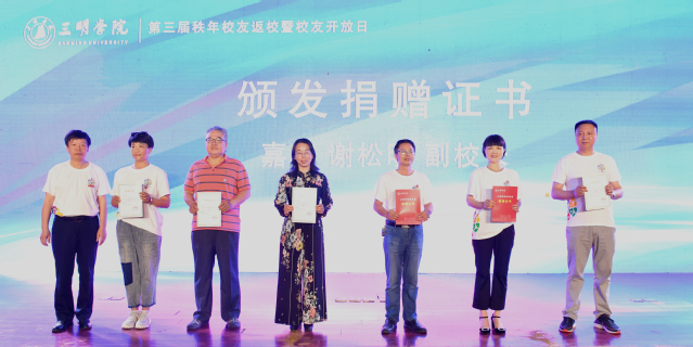 长期以来,广大校友感恩母校、反哺母校,以多种形式助力学校事业发展。一年来,1992级土建班捐建垂裕祠周边景观改造项目,1989级中文1班、1989级中文2班、1989级政教班、1989级体育班、1993级政教班捐建校友林建设项目,1989级音乐班捐建艺术楼音乐厅景观石项目,1986级音乐校友罗健捐赠电子钢琴,还有一些校友认捐校友林树木等等,体现了校友们对母校的拳拳眷恋之情和殷殷期望之情。启动仪式上,对捐赠单位和个人授予了捐赠赠书。1992级土建班说道:“希望把爱在三明学院好火炬一直传递下去,脚踏实地,不懈努力,为建设更加美丽、更加文明的三明学院而增砖添瓦!”1989级体育班级这样说道:“齐聚狮子山下,分别沙溪河畔。岁月匆匆三十载,同捐桂树念恩情。吾辈学成献青春,学府繁荣谱新篇。”
