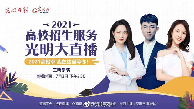据悉,2021高校招生服务光明大直播,由《光明日报》主办,安排约100所高校进行直播,福建仅2所高校入选。2021年我校将面向全国28个省区市招生,招生计划共计3950人,其中普通本科招生计划3620人,高职分类考试100人,专升本230人,41个招生专业,涵盖工学、理学、教育学、管理学、文学、经济学、艺术学七大学科门类。