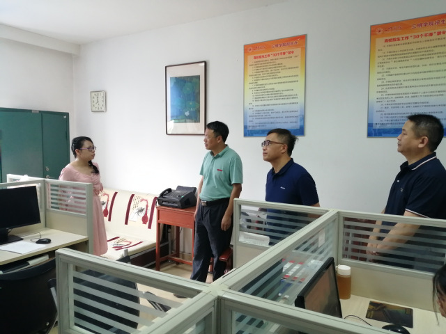 在招生办公室,校领导详细了解今年新高考改革形势下招生录取情况。要求招生办必须严守招生纪律,严格录取流程,圆满完成录取工作;要及时向二级学院反馈专业录取情况,做好招生录取数据分析与工作总结,为学校专业结构优化和招生计划调整提供数据参考。