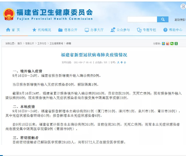 自9月10日以来,福建省累计报告本土确诊病例261例,目前住院261例,无死亡病例;现有本土无症状感染者尚在接受集中隔离医学观察9例(莆田市9例)。
