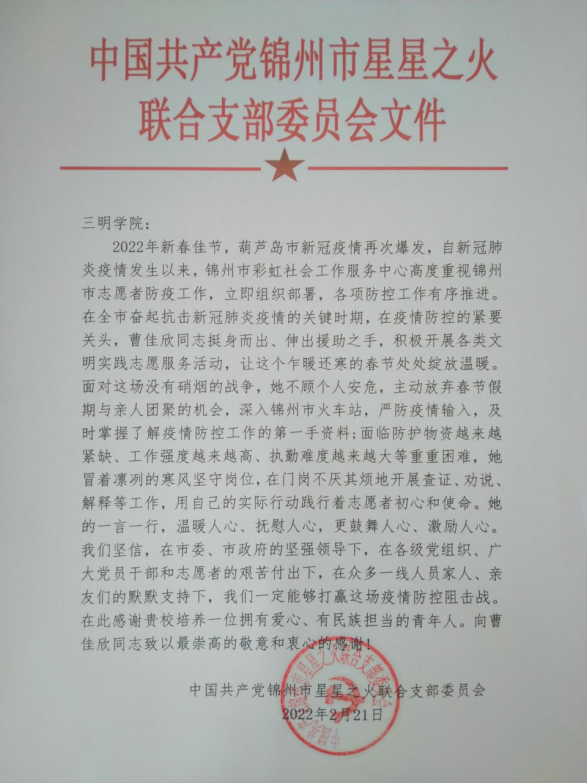 2022年2月28日,海外学院(外国语学院)收到一封来自锦州市星星之火联合支部的表扬信。信中对2020级财务管理专业曹佳欣同学提出了表扬。