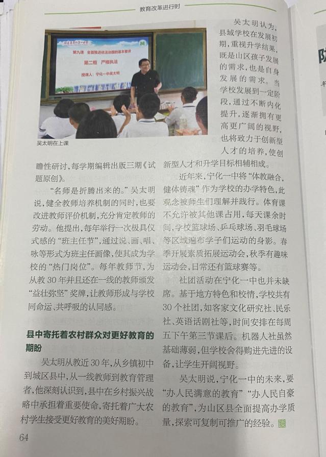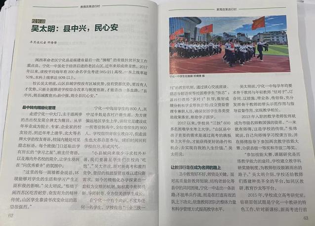 校长吴太明说,山区县域学校没有区域优势,没有资源优势,更没有人才优势,只能全面推进学校综合改革与制度创新,才能杀出一条血路。“县中兴,则县域教育兴;县中强,则全县民心安。”