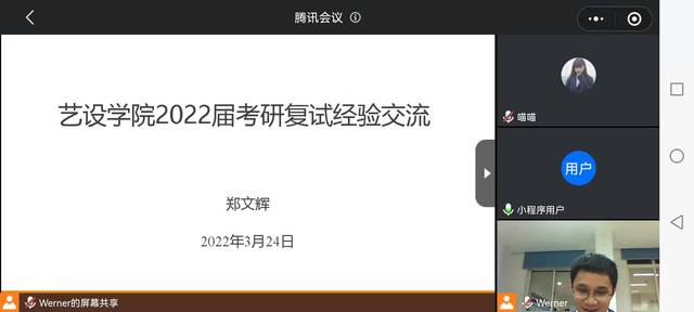 为助力2022届考研学子顺利完成研究生复试与调剂,营造积极向上的学习氛围。艺术与设计学院于3月24日晚在腾讯会议举办2022届考研复试经验交流讲座,主讲人为美丽中国研究院副院长郑文辉博士,艺术与设计学院研究生考试初试过线学子及备战考研的同学参加。