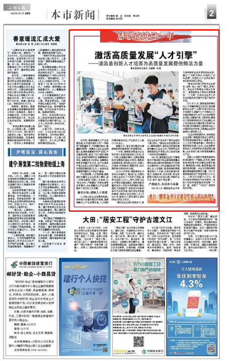 2021年,清流县还出台了《清流县关于推动现代职业教育高质量发展的实施方案》和《清流县关于加强化工新材料人才队伍建设的若干措施》,从人才培养、服务保障和氛围营造等21个方面,为职业教育办学能力、奖教奖学、生活安家、职业职称等方面加大补助力度,持续打出引才、育才、留才“组合拳”。